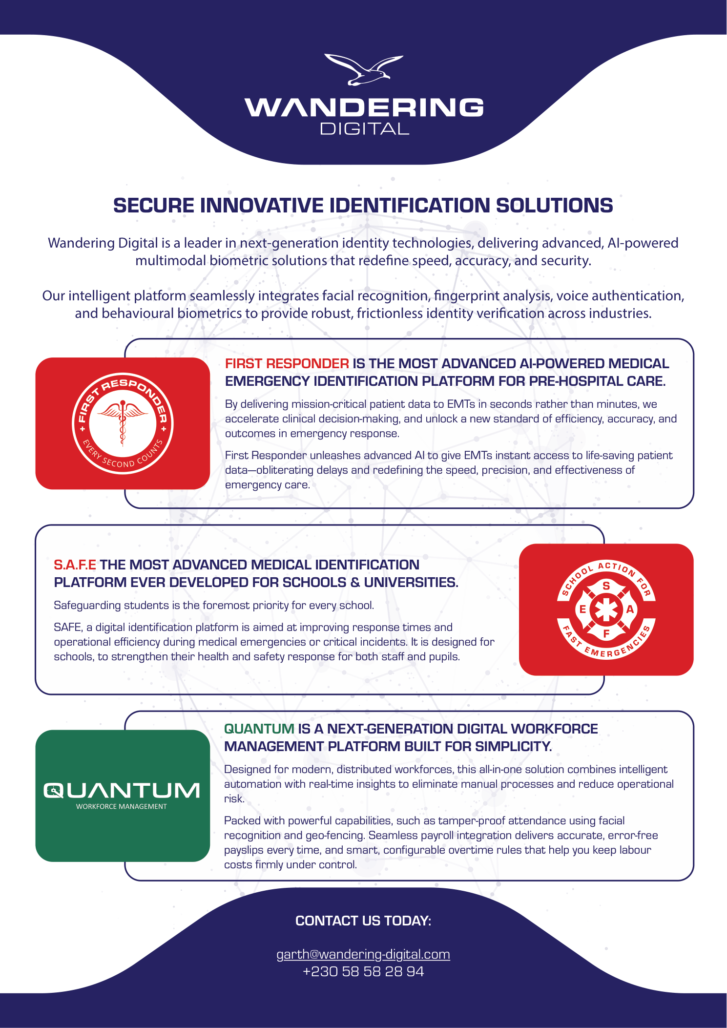 Wandering Digital Limited is an identity technology company based in Trou aux Biches, Mauritius. We use AI-powered multimodal biometrics to verify real humans behind every high-risk digital interaction.